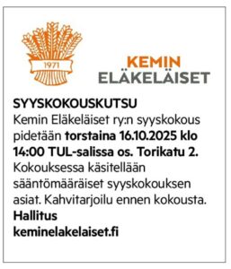 Kemin Eläkeläisten hallitus päätti jäsenten kokoontumispäivän kulkuun muutamia tarkennuksia.Kahvila avautuu jo klo 08.30.